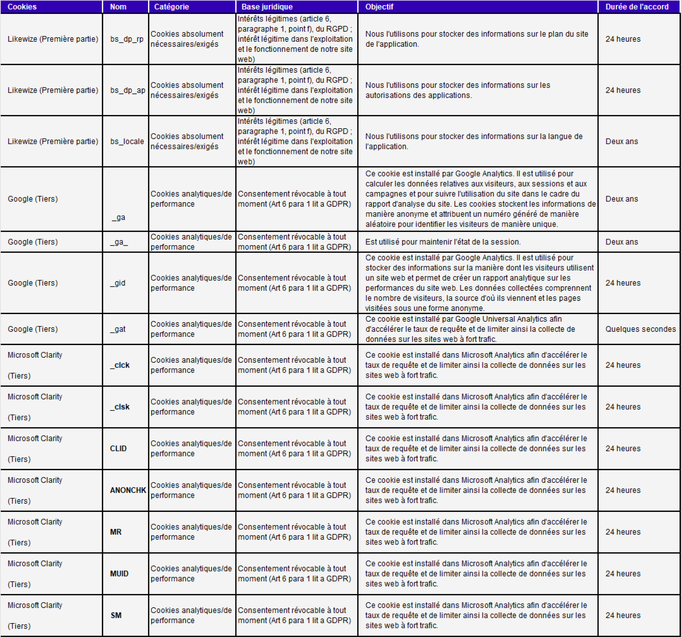 Vous trouverez ci-dessous des informations sur les différents cookies que nous utilisons (type de cookie, finalité, base juridique, durée, indication de l’existence d’un cookie de première partie ou d’un cookie de tierce partie).